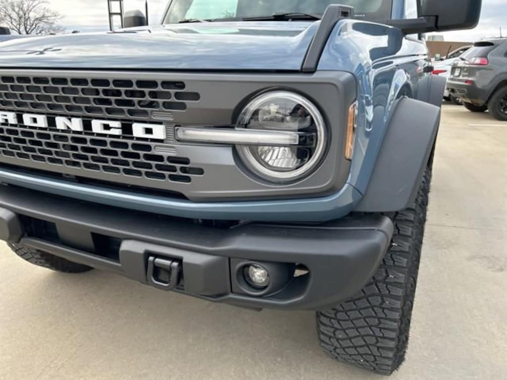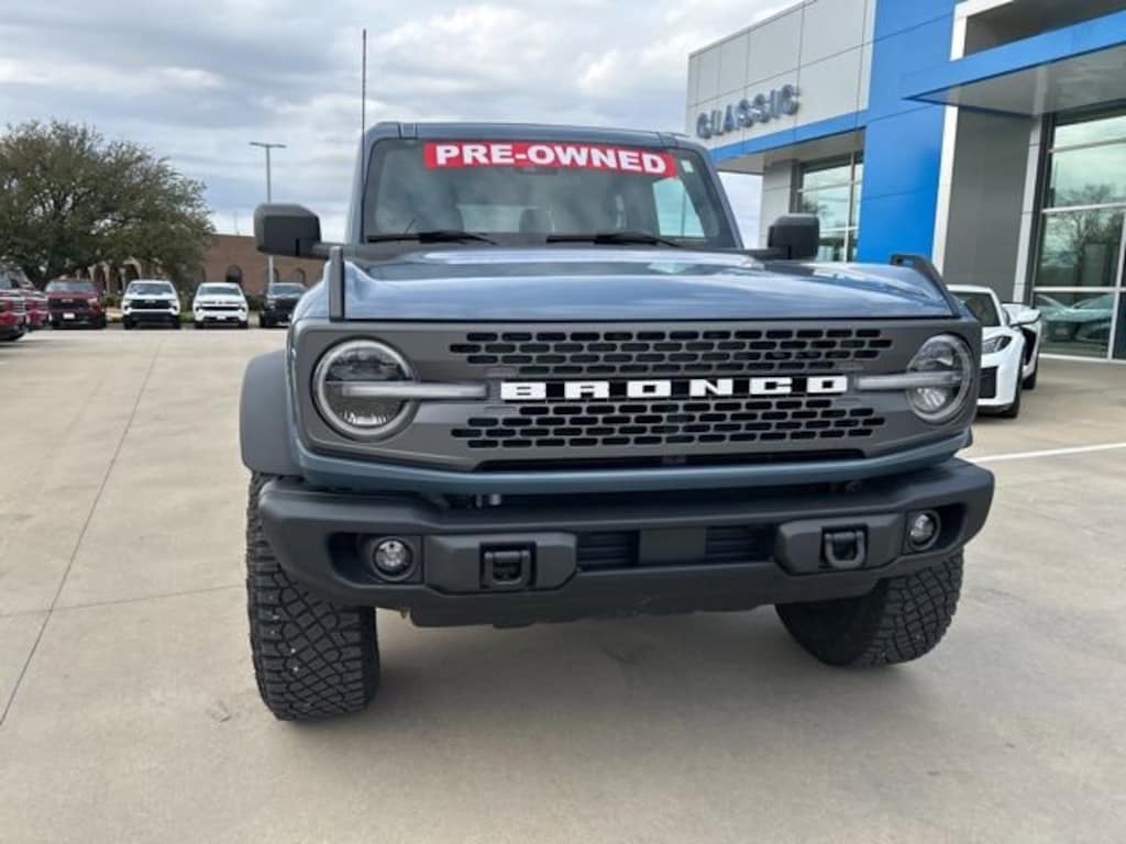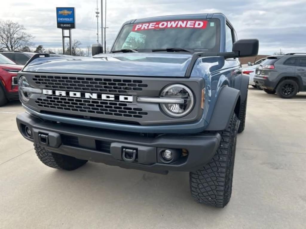 CARFAX One-Owner. Azure Gray Metallic Tri-Coat 2023 Ford Bronco Badlands 2.7L EcoBoost V6 4WD 10-Speed Automatic The 2023 Ford Bronco comes with the following features; Equipment Group 332A Mid Package (2-Door Intelligent Access w/Lock/Unlock, Ambient Footwell Lighting, Auto-Dimming Interior Rear-View Mirror, Connected Navigation, Dr & Pass Illuminated Sliding Visor Vanity Mirrors, Dual-Zone Electronic Automatic Temperature Control, Enhanced Voice Recognition, Front Row Heated Seats, Power Outlet - Back Side of Center Floor Console, and Rear Parking Sensors), Sasquatch Package (Wheels: 17 Black High Gloss-Painted Aluminum), 4-Wheel Disc Brakes, 7 Speakers, ABS brakes, Air Conditioning, Alloy wheels, AM/FM radio: SiriusXM with 360L, AM/FM Stereo, Auto High-Beam Headlamps, Auto High-beam Headlights, BLIS Blind Spot Information System, Brake assist, Compass, Convertible HardTop, Convertible roof lining, Delay-off headlights, Driver door bin, Driver vanity mirror, Dual front impact airbags, Dual front side impact airbags, Electronic Stability Control, Emergency communication system: 911 Assist, Exterior Parking Camera Rear, Front & Rear Floor Liners w/o Carpet Floor Mats, Front anti-roll bar, Front Bucket Seats, Front Center Armrest, Front reading lights, Front wheel independent suspension, Fully automatic headlights, Glass rear window, Hard Top Sound Deadening Headliner (DISC), Heated door mirrors, Illuminated entry, Integrated roll-over protection, Lane-Keeping System, Leather Shift Knob, Low tire pressure warning, Marine Grade Vinyl Bucket Seats, Occupant sensing airbag, Outside temperature display, Overhead airbag, Overhead console, Panic alarm, Passenger door bin, Passenger vanity mirror, Power door mirrors, Power steering, Power windows, Pre-Collision Assist w/Automatic Emergency Braking, Radio data system, Radio: 7 Speakers w/Subwoofer, Rear window defroster, Rear window wiper, Rear-View Camera, Remote keyless entry, Removable Hoop Step, Security system, SiriusXM Radio w/360L, Speed control, Split folding rear seat, Steering wheel mounted audio controls, SYNC 4, Tachometer, Telescoping steering wheel, Tilt steering wheel, Towing Capability, Traction control, Trip computer, Variably intermittent wipers, Voltmeter, and Wheels: 17 Machined Carbonized Aluminum.