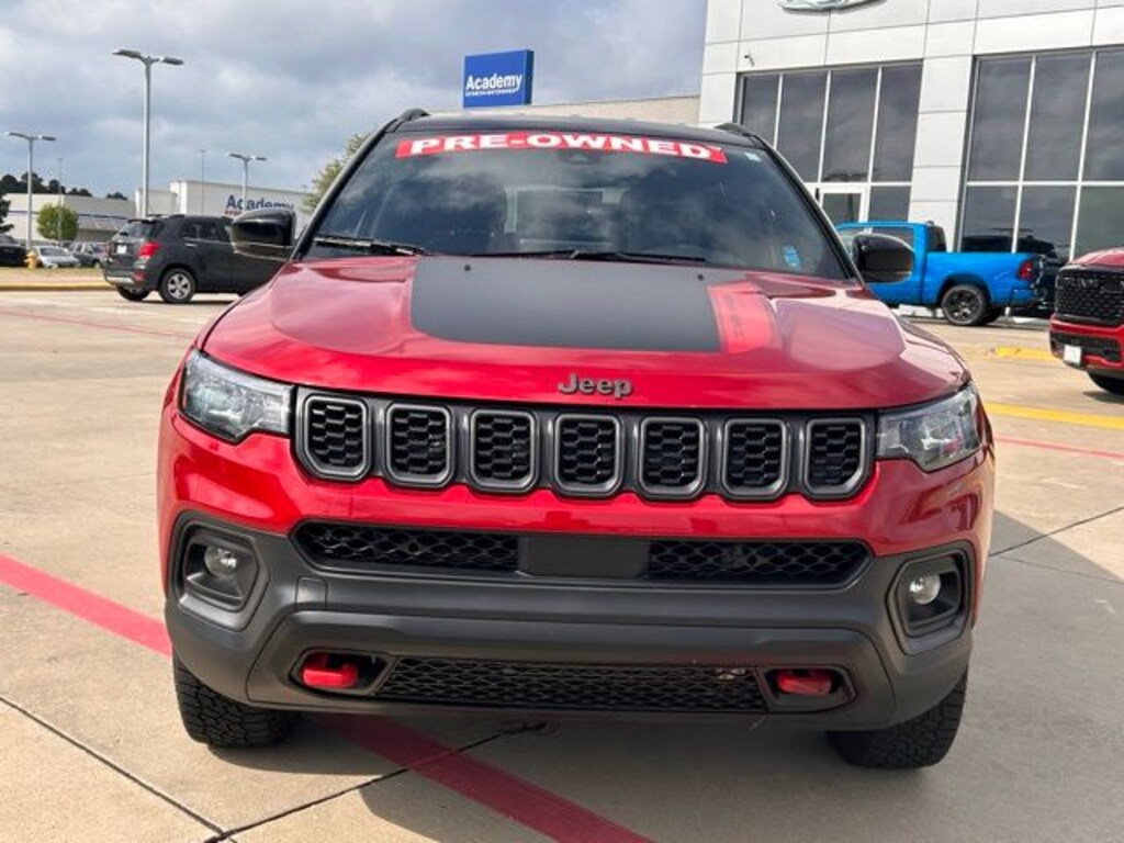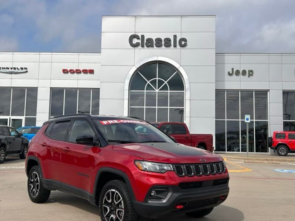 CARFAX One-Owner. 24/32 City/Highway MPG Classic CDJR in Texarkana is proud to offer this great 2025 Jeep Compass in Red Hot Pearlcoat. This 2025 Jeep Compass comes with the following features; Quick Order Package 29E, 4WD, 10.1" Touchscreen Display, 4-Wheel Disc Brakes, 4.398 Final Drive Ratio, 6 Speakers, ABS brakes, Air Conditioning, Alloy wheels, AM/FM radio: SiriusXM, Apple CarPlay/Android Auto, Auto High-beam Headlights, Auto-dimming Rear-View mirror, Automatic temperature control, Brake assist, Bumpers: body-color, Compass, Delay-off headlights, Driver door bin, Driver vanity mirror, Dual front impact airbags, Dual front side impact airbags, Electronic Stability Control, Emergency communication system: Jeep Connect, Four wheel independent suspension, Front anti-roll bar, Front Bucket Seats, Front Center Armrest w/Storage, Front dual zone A/C, Front fog lights, Front License Plate Bracket, Front reading lights, Fully automatic headlights, Heated door mirrors, Illuminated entry, Knee airbag, Leather Shift Knob, Leather steering wheel, Low tire pressure warning, Occupant sensing airbag, Outside temperature display, Overhead airbag, Overhead console, Panic alarm, ParkView Rear Back-Up Camera, Passenger door bin, Passenger vanity mirror, Power door mirrors, Power steering, Power windows, Premium audio system: UConnect 5, Premium Cloth/Leather Trim Bucket Seats, Radio: Uconnect 5 w/10.1" Display, Rain sensing wipers, Rear anti-roll bar, Rear seat center armrest, Rear window defroster, Rear window wiper, Remote keyless entry, Security system, Speed control, Split folding rear seat, Spoiler, Steering wheel mounted audio controls, Tachometer, Telescoping steering wheel, Tilt steering wheel, Traction control, Trip computer, Turn signal indicator mirrors, Variably intermittent wipers, and Wheels: 17" x 6.5" Painted Black Aluminum. 4WD.