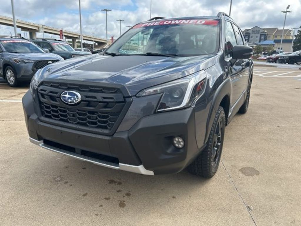 This 2023 Subaru Forester comes equipped with the following features 4-Wheel Disc Brakes, 4.11 Axle Ratio, 6 Speakers, ABS brakes, Air Conditioning, Alloy wheels, AM/FM radio: SiriusXM, Anti-whiplash front head restraints, Auto High-beam Headlights, Automatic temperature control, Brake assist, Bumpers: body-color, CD player, Driver door bin, Driver vanity mirror, Dual front impact airbags, Dual front side impact airbags, Electronic Stability Control, Emergency communication system: STARLINK Safety and Security (Subscription Required), Exterior Parking Camera Rear, Four wheel independent suspension, Front anti-roll bar, Front Bucket Seats, Front Center Armrest, Front dual zone A/C, Front fog lights, Front reading lights, Fully automatic headlights, Heated door mirrors, Heated Front Bucket Seats, Heated front seats, Illuminated entry, Knee airbag, Leather Shift Knob, Low tire pressure warning, Occupant sensing airbag, Outside temperature display, Overhead airbag, Overhead console, Panic alarm, Passenger door bin, Passenger vanity mirror, Power door mirrors, Power driver seat, Power moonroof: Panoramic, Power steering, Power windows, Radio data system, Radio: Subaru Starlink 8.0" Multimedia Plus System, Rear anti-roll bar, Rear seat center armrest, Rear window defroster, Rear window wiper, Remote keyless entry, Roof rack: rails only, Security system, Speed control, Speed-sensing steering, Split folding rear seat, Spoiler, STARLINK/Apple CarPlay/Android Auto, Steering wheel mounted audio controls, Tachometer, Telescoping steering wheel, Textured StarTex Upholstery, Tilt steering wheel, Traction control, Trip computer, Turn signal indicator mirrors, Variably intermittent wipers, and Wheels: 17" x 7.0 J Matte Black Finish Alum-Alloy. Clean CARFAX. CARFAX One-Owner. 2023 Subaru Forester Wilderness AWD 2.5L 4-Cylinder DOHC 16V